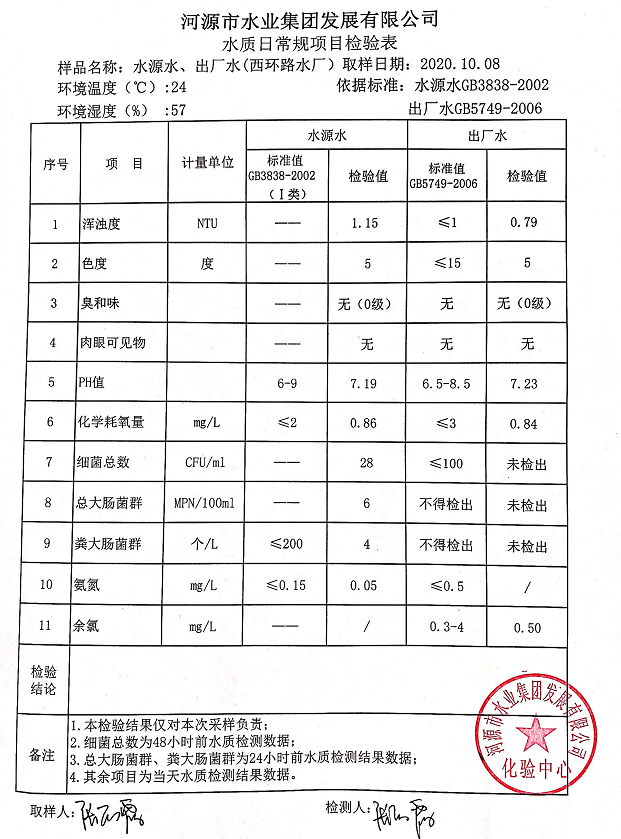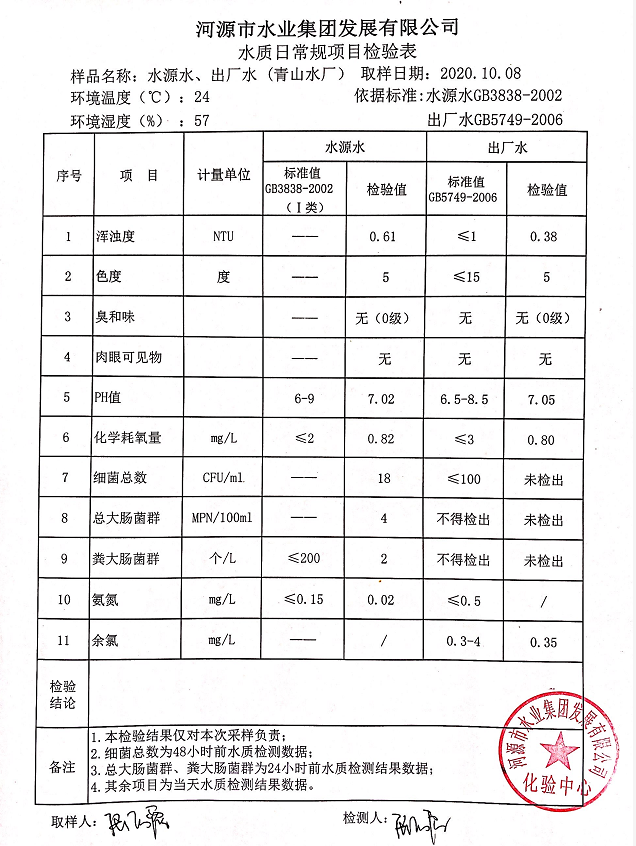 2020年10月8日水質檢驗報告