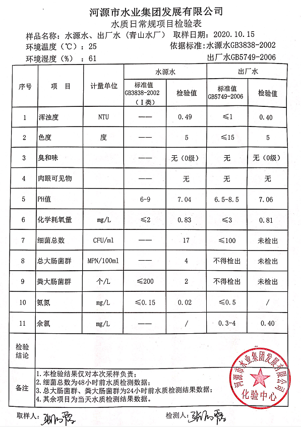 2020年10月15日水質(zhì)檢驗(yàn)報(bào)告