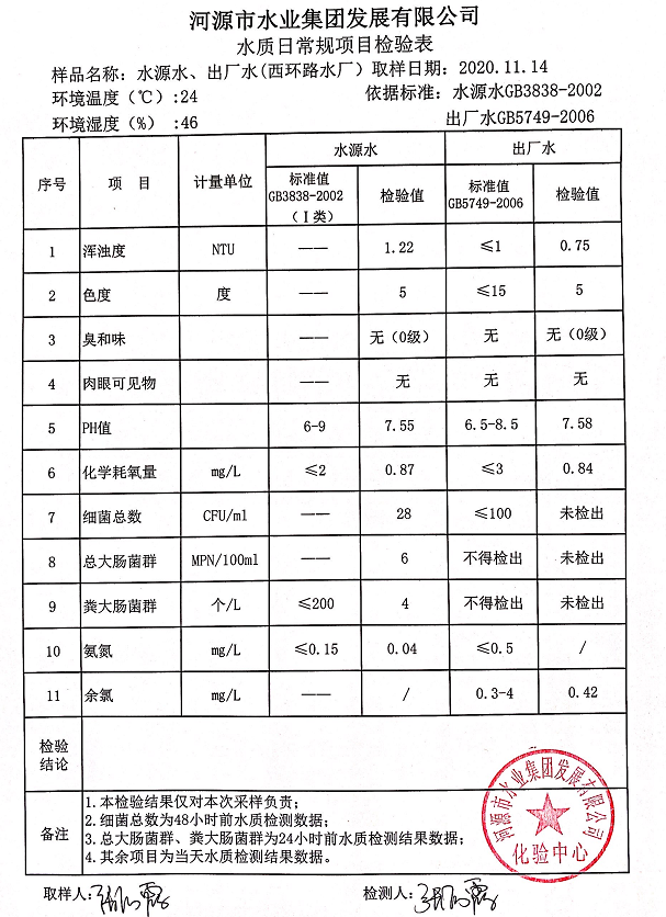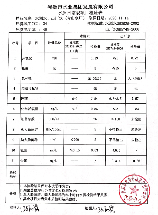 2020年11月14日水質(zhì)檢驗報告