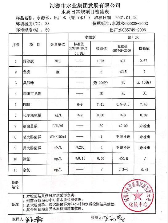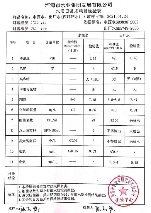 2021年1月24日水質檢驗報告