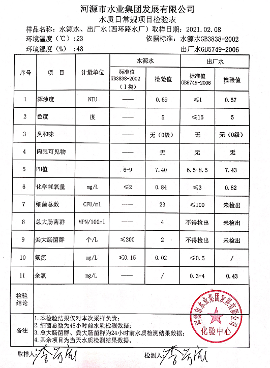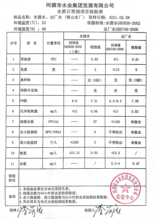 2021年2月8日水質(zhì)檢驗(yàn)報告