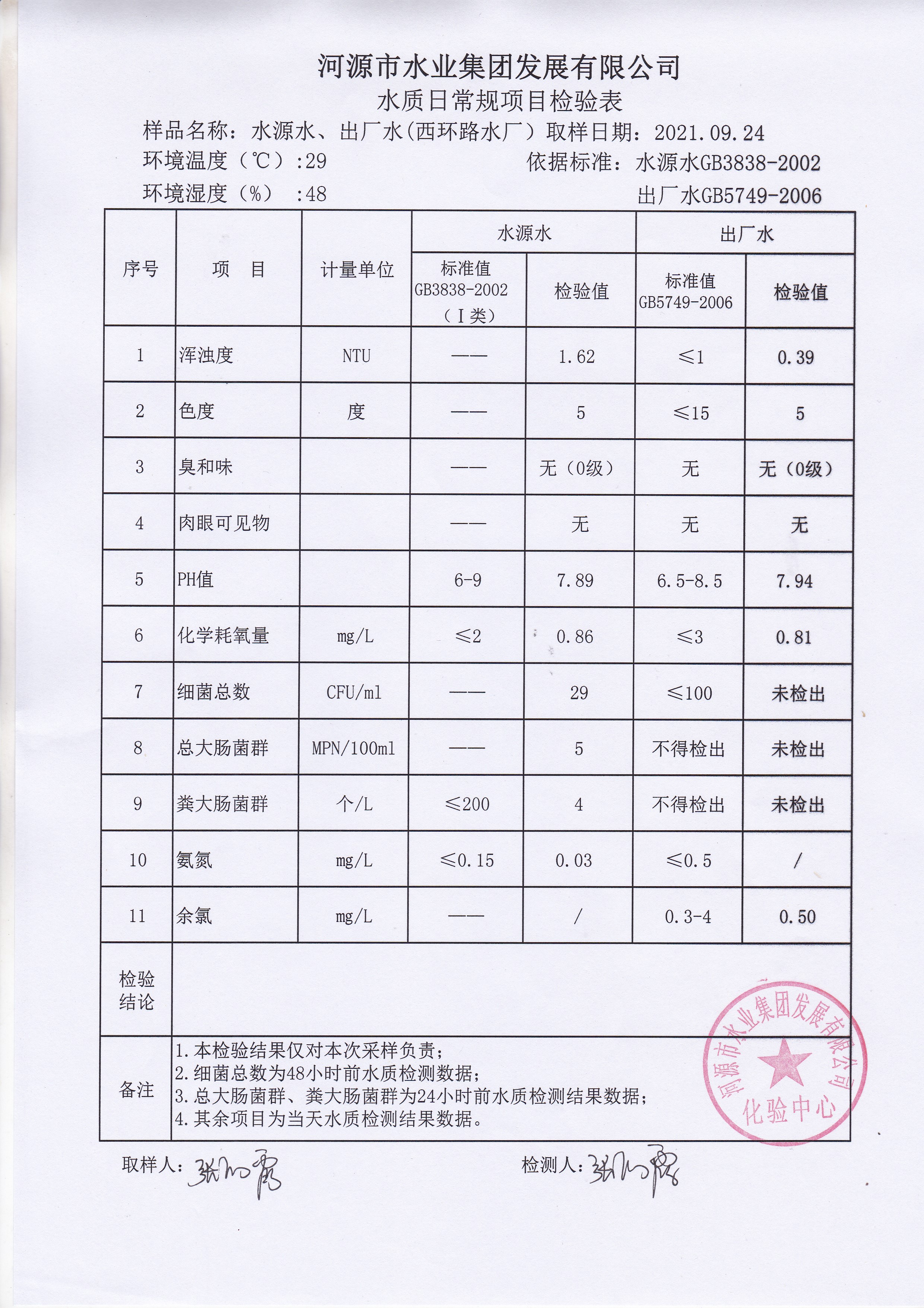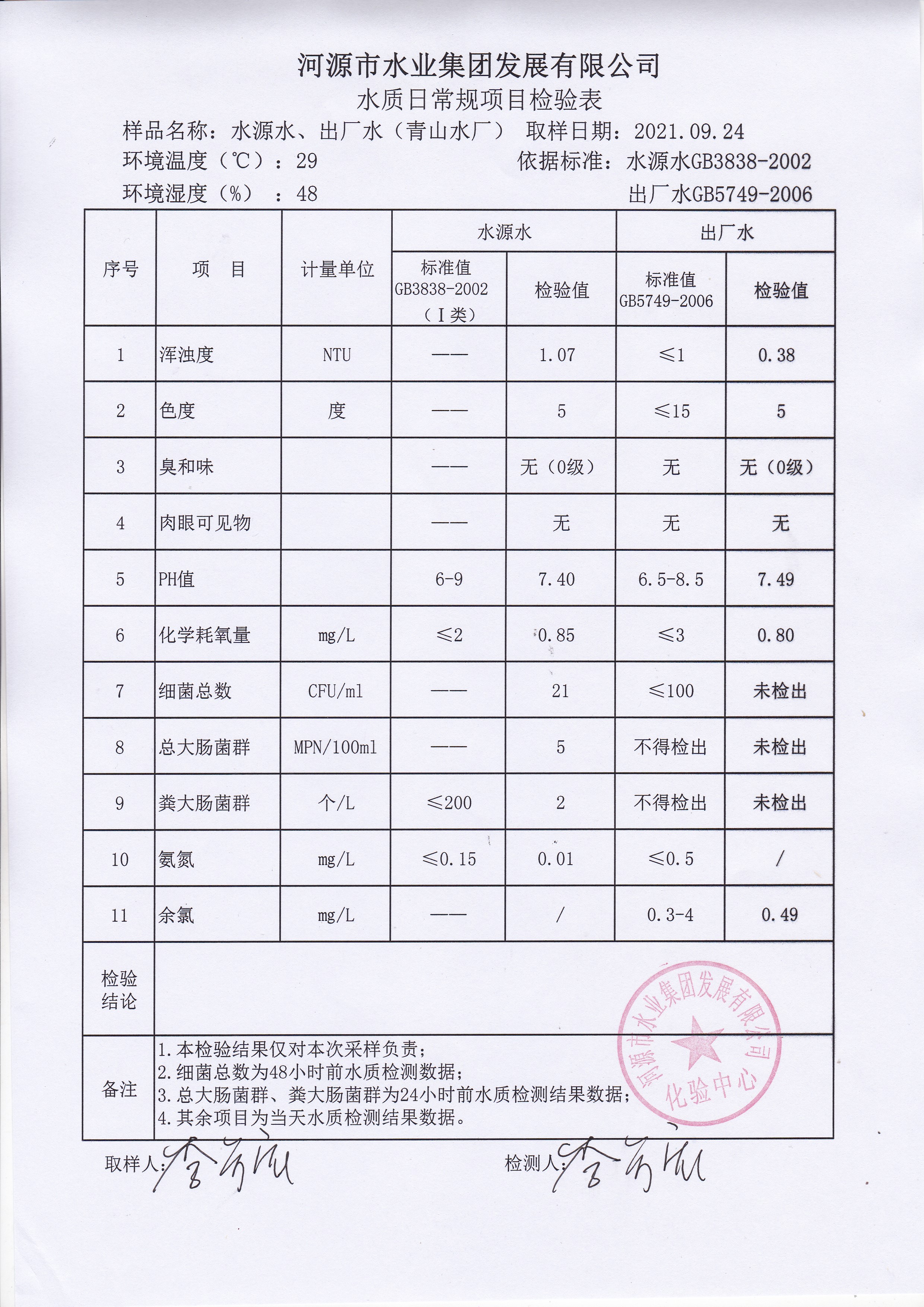 2021年9月24日水質(zhì)檢驗(yàn)報告