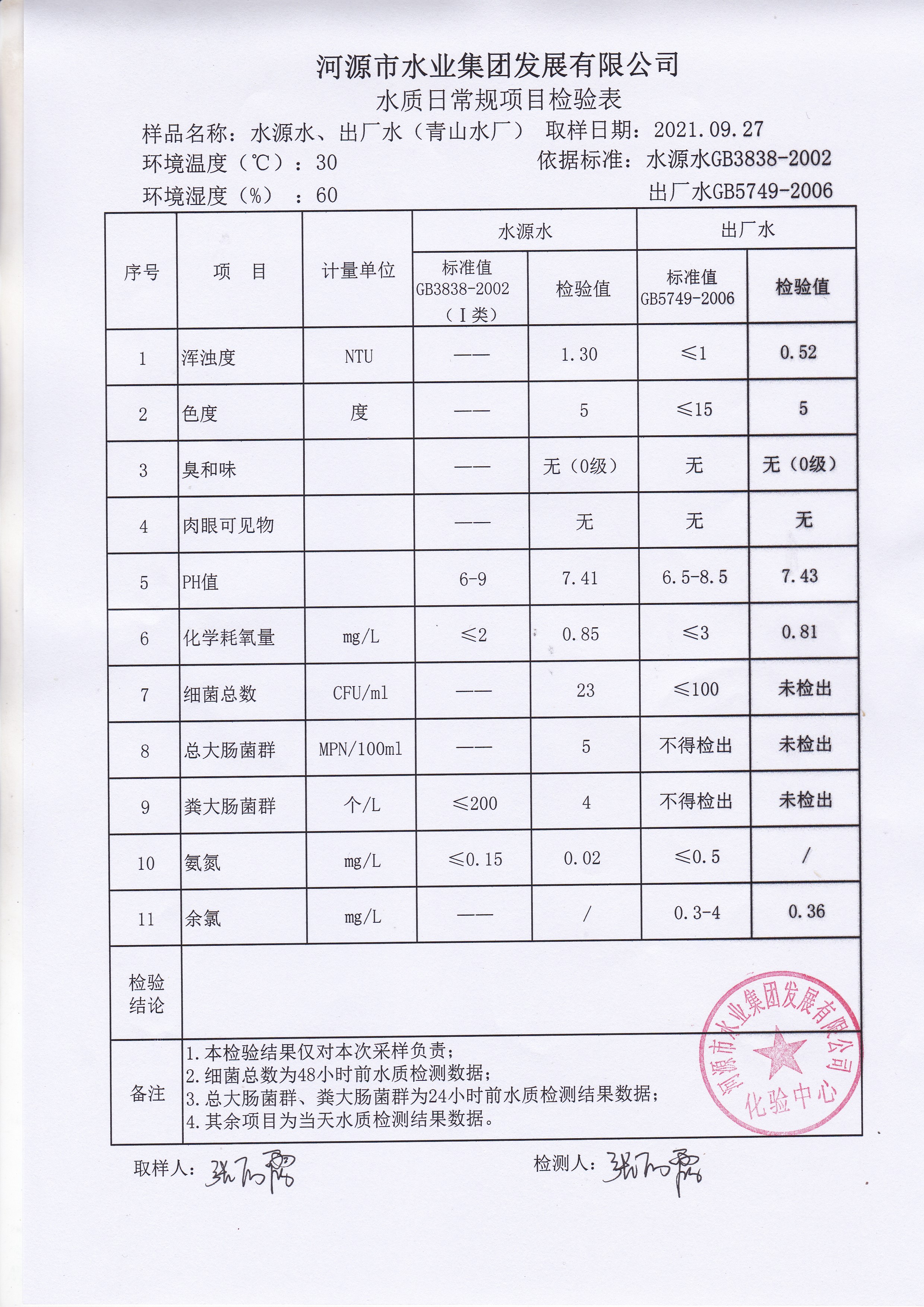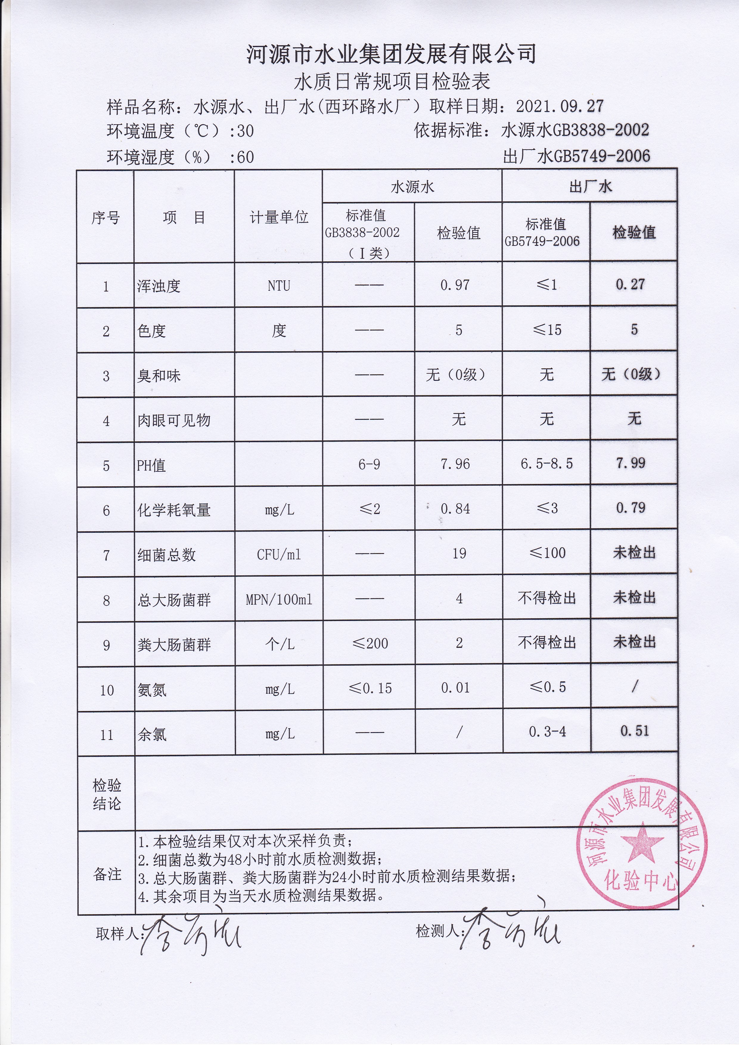 2021年9月27日水質(zhì)檢驗報告